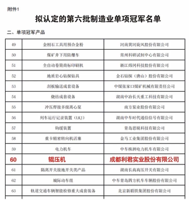 近日,工業(yè)和信息化部發(fā)布了《關(guān)于制造業(yè)單項(xiàng)冠軍第六批遴選和第三批通過(guò)復(fù)核企業(yè)名單的公示》,四川省5家企業(yè)上榜第六批制造業(yè)單項(xiàng)冠軍企業(yè)公示名單,成都利君實(shí)業(yè)股份有限公司輥壓機(jī)入選制造業(yè)單項(xiàng)冠軍產(chǎn)品名單。