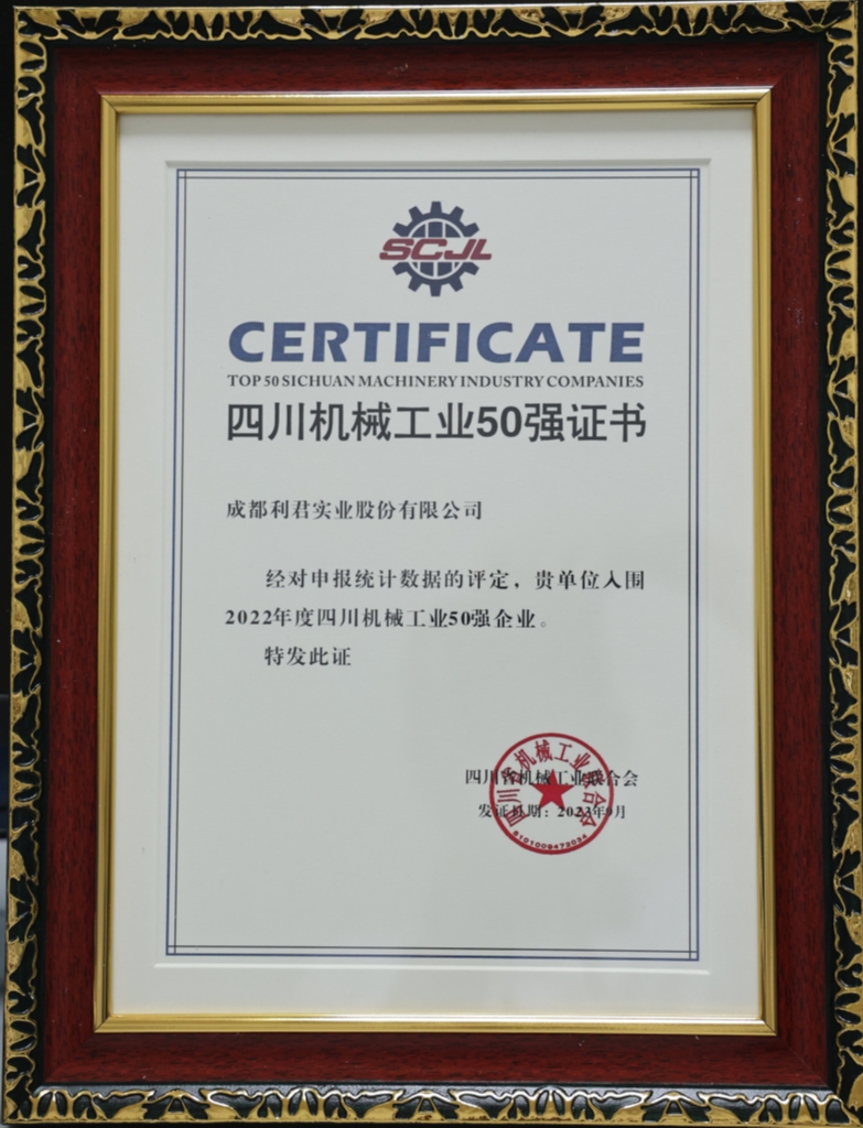 四川機械工業(yè)50強企業(yè)評選活動由四川省機械工業(yè)聯(lián)合會主辦,在省經(jīng)信廳、各市州經(jīng)信局及相關行業(yè)協(xié)會的大力支持下,從2020年開始兩年評定一次,旨在宣傳推廣四川機械制造行業(yè)企業(yè),增強“四川造”品牌和社會影響力,推動省內(nèi)各類企業(yè)做優(yōu)做強。本次評選按照“企業(yè)規(guī)?!薄ⅰ皟r值效益”、“創(chuàng)新轉型”、“高質量發(fā)展”四項指標進行綜合評定,成都利君憑借優(yōu)秀的質量效益、強大的自主創(chuàng)新能力、深厚的發(fā)展?jié)摿A得專家評委一致認可,斬獲其殊榮。