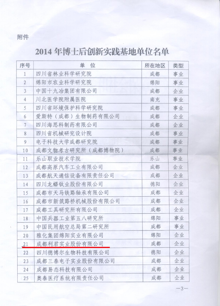 公司于2014年6月30日獲得四川省人力資源和社會保障廳批準的博士后創(chuàng)新實踐基地。